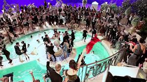 Props: The props aid the effect of the party: the confetti, the females hair pieces and the pool all collectively show how out-there the party is. Also, the orchestra props convey how upper class the party is and how rich Gatsby must be.